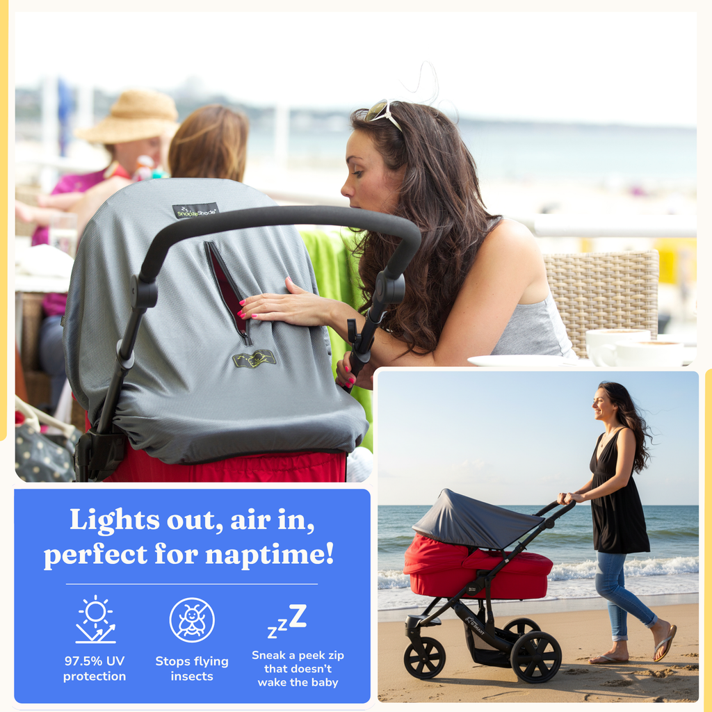 SnoozeShade makes that easy – blocking up to 97.5% of UV while allowing airflow and visibility for parents. Designed for safe sleep and peace of mind.