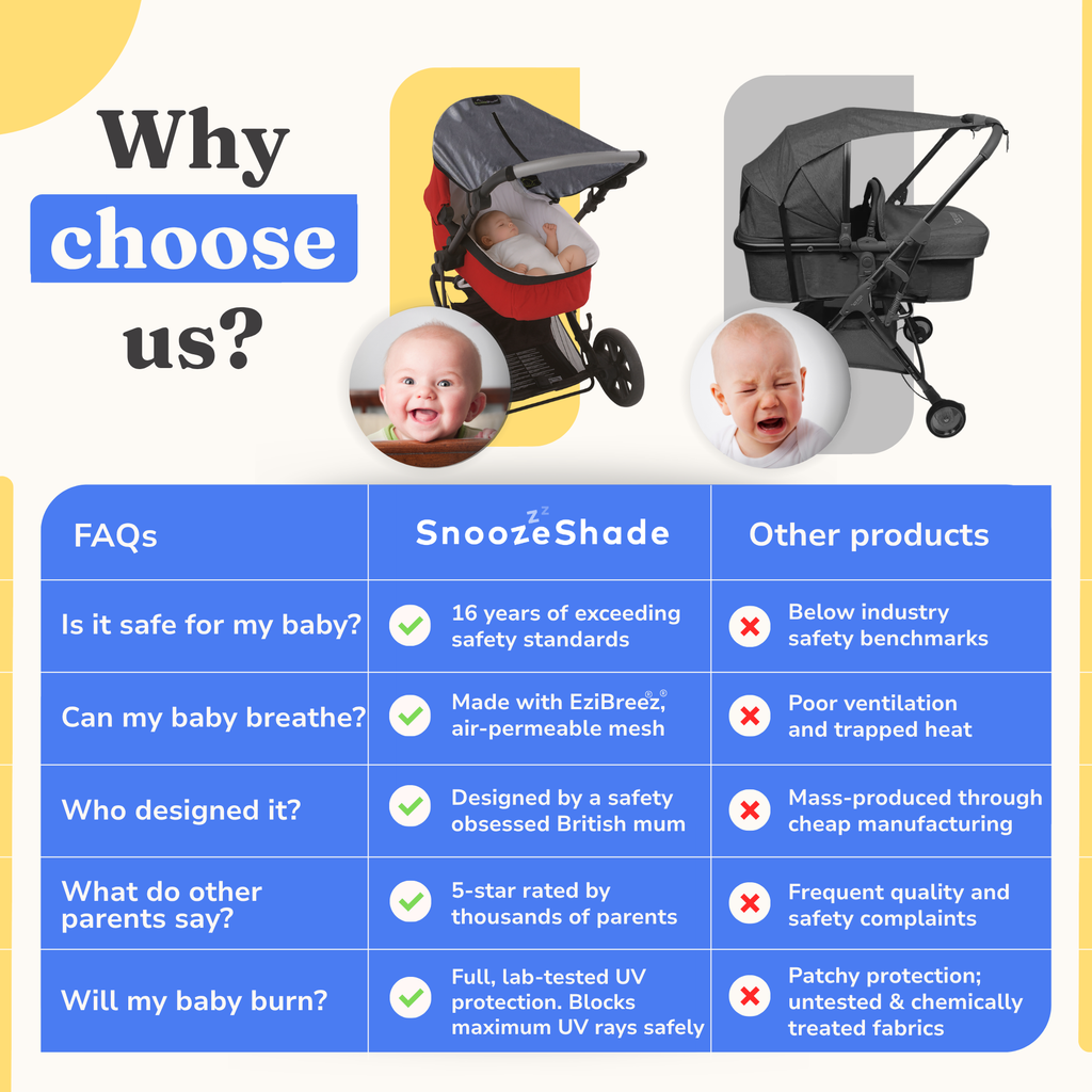 Why not just use a parasol? Many parents find that traditional pram parasols don’t offer enough protection - constantly need adjustment and often leave babies exposed to direct sunlight. SnoozeShade was developed as a safer, more dependable alternative that stays securely in place and provides consistent shade, no matter which way you’re walking.