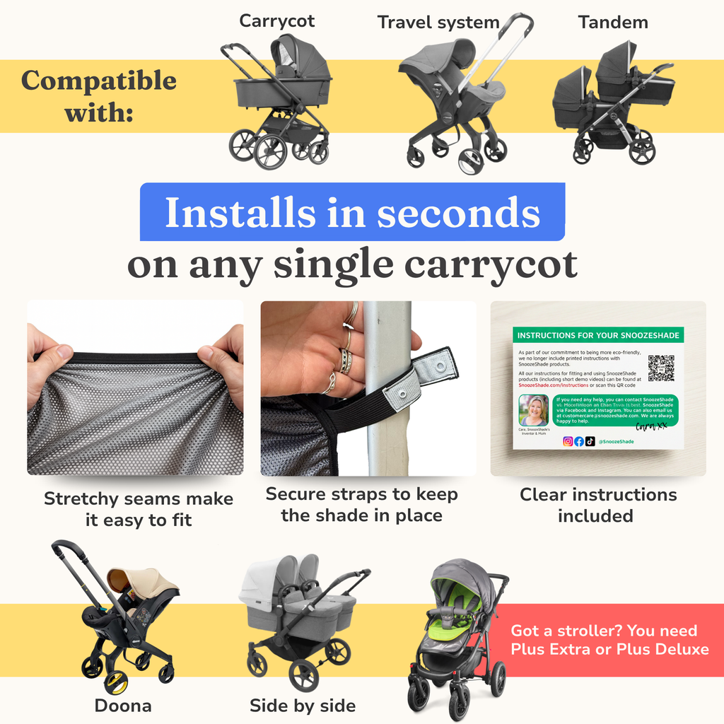 This award-winning sun and sleep shade attaches in seconds to absolutely any single-width pram or travel system with a hood including the popular Doona car seat stroller.