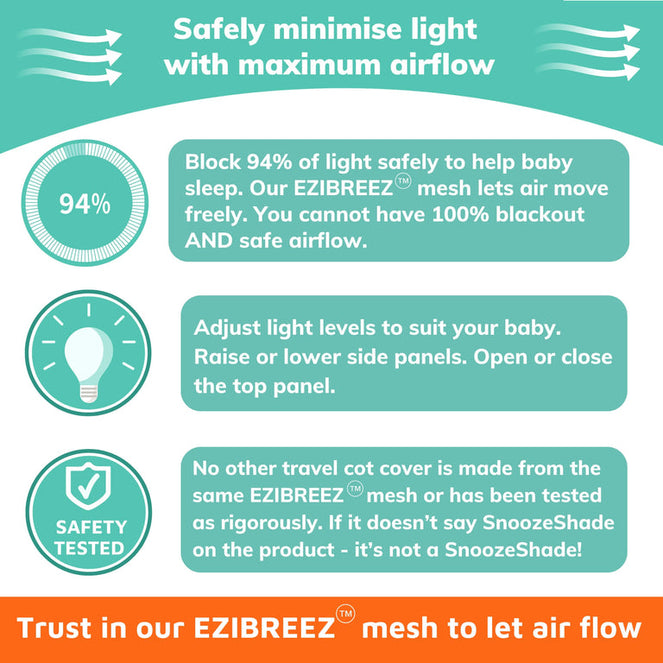 For us, safety comes first above all else, and we're proud that SnoozeShade is a ‘function over fashion’ product. We won’t compromise on safety and regularly put our products through rigorous safety testing – including tests that aren't compulsory. Head to our blog to find out more.