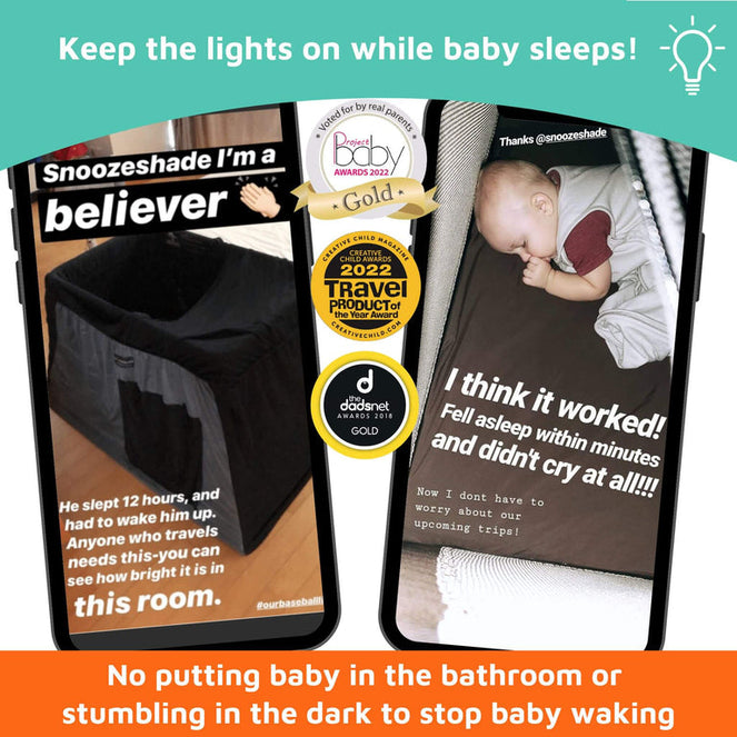 Wherever you go, this portable blackout shade instantly transforms your travel cot into a safe and cosy space for your baby or toddler. Whether they're being looked after by someone else, you're in holiday accommodation or you're simply somewhere with no curtains or blinds, SnoozeShade is THE solution when you need your baby to sleep away from home.