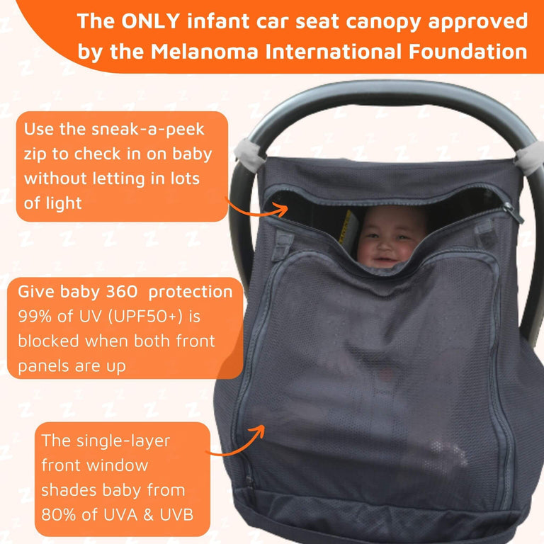 Why should I keep my baby out of the sun? Doctors state that babies under six months must be kept completely out of direct sunlight. Their skin is too sensitive for sunscreen and contains very little melanin, so they burn easily. The Skin Cancer Foundation says incidents of sunburn during childhood multiply the risk of one day developing skin cancer. SnoozeShade is the ONLY infant car-seat canopy approved by the Melanoma International Foundation.