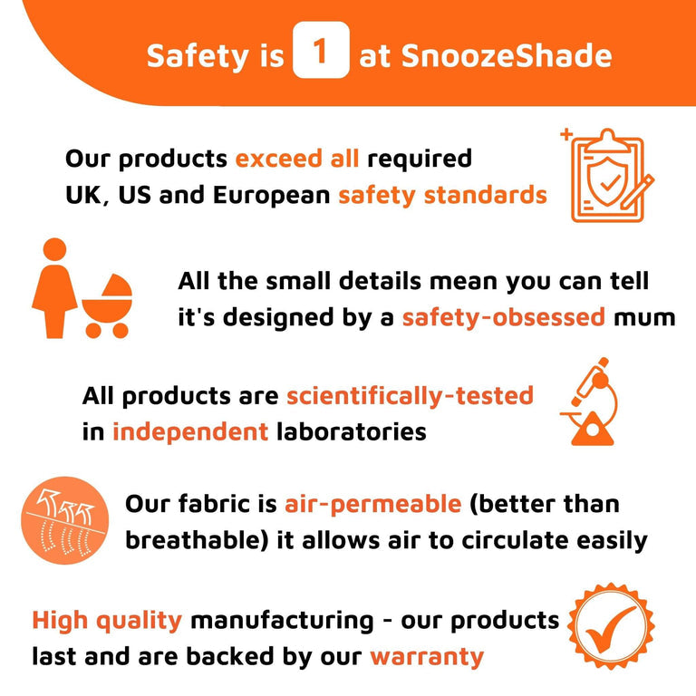Why SnoozeShade is safe to use: SnoozeShade was invented by Cara Sayer – a safety-obsessed mum who wanted to help her daughter sleep soundly and stay protected from the sun while in her pushchair. Unlike a blanket or muslin, our scientifically tested fabric is air permeable, which means air passes through it freely both indoors and outdoors. Hold a SnoozeShade up to your face and you’ll find you can breathe comfortably.