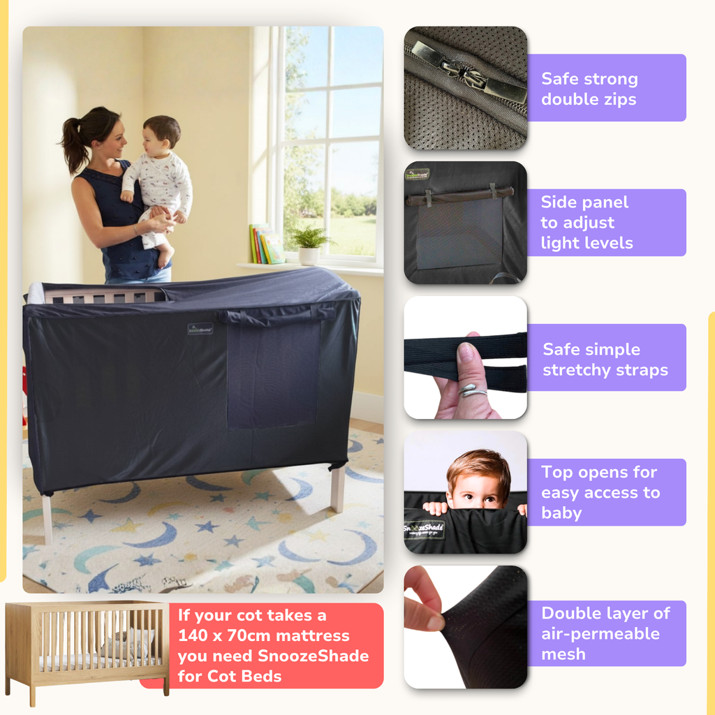 Please note: SnoozeShade for Cots and Mini Cot Beds does NOT fit cotbeds that take a 140cm x 70cm mattress. Click here to see our version for cotbeds.
