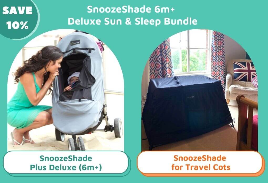 This essential bundle includes a SnoozeShade Plus Deluxe and a SnoozeShade for Travel Cots.